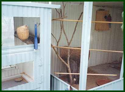 Above: 1st Turq aviary. Normal hen front, Red-bellied Turq rear.