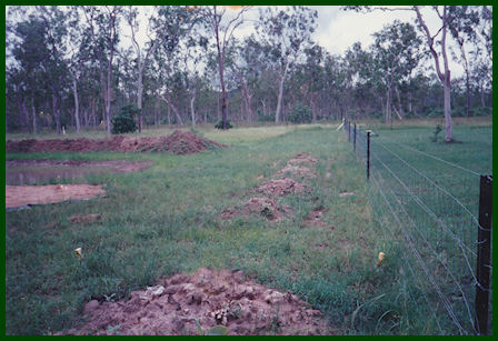 We had our block divined for water by Ion Newton and as soon the contract went through on the block and with the builder, we had Ion drill a bore, while we set about starting to dig our pond (that's the mound of dirt you can see half way down the block) and dig footings for my aviary set-up. We were held up by rain on numerous occasions and so was the builder, but the rain certainly helped with digging of the pond which was extremely hard going and took 5 - 6 digs between rain to get a decent depth and size.