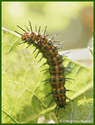 More photos below of Tawny Coster larvae and Glasswing larvae for comparison. Not the greatest photos, but with several misidentifications I have found on the internet, they are OK for comparison.