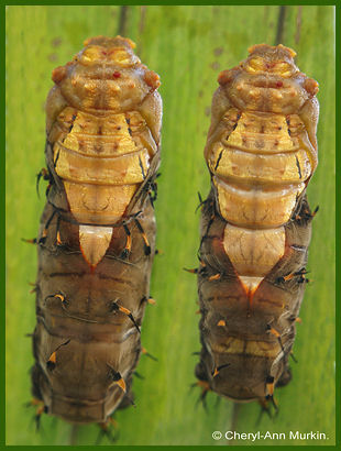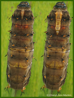 Above: (L) - Dorsal view - 27/6/17 at 8:13:24am and (R) - Wings, eyes, legs, etc visible through chrysalis. Not far from eclosion. Taken: 27/6/17.